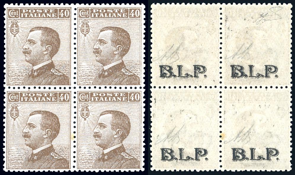 1922/23 - 40 cent. soprastampa BLP del II tipo in nero solo al verso (9Ad), blocco di quattro, gomma originale integra, perfetto, un puntino di ossidazione. Molto fresco. A.Diena.