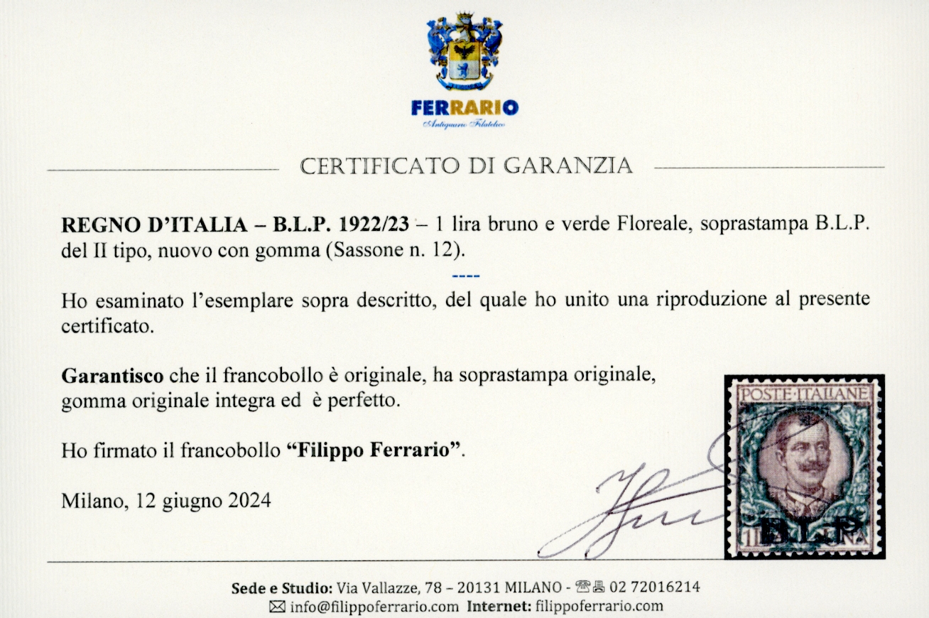 1922/23 - 1 lira soprastampa BLP del II tipo (12), gomma originale integra, perfetto. Emilio e Enzo Diena, cert. Ferrario.