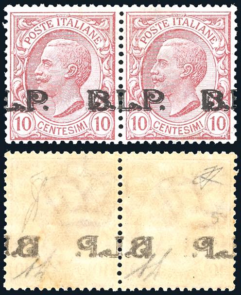 1923 - 10 cent, soprastampa BLP del III tipo fortemente spostata in senso orizzontale, "a cavallo", decalco della soprastampa (13f,nota), coppia orizzontale, gomma originale integra, perfetta. A.Diena, cert. Ferrario.