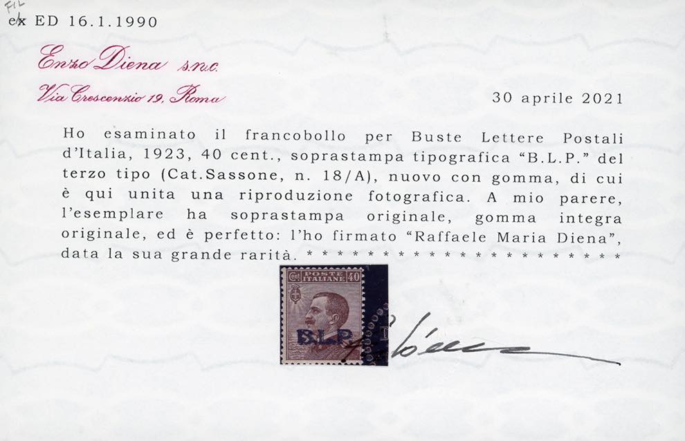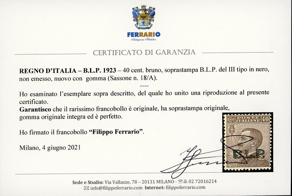 1923 - 40 cent. Michetti, soprastampa BLP del III tipo, non emesso (18A), gomma originale integra, perfetto. UNO DEI SOLI SEI ESEMPLARI NOTI, SI TRATTA DEL FRANCOBOLLO PIU' RARO DEL REGNO D'ITALIA. Rarità di prima grandezza dell'Area Italiana. Cert. Diena e Ferrario.