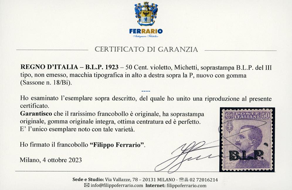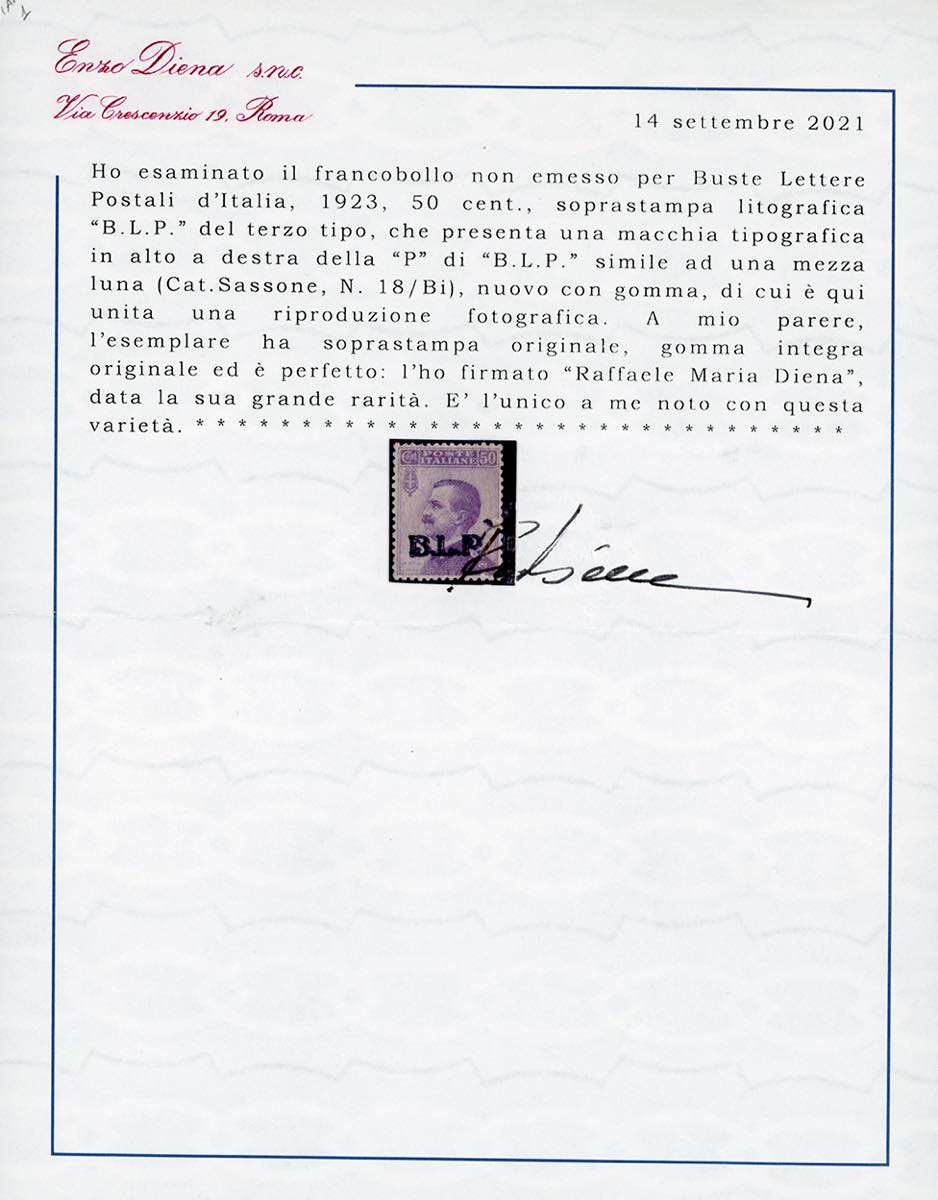 1923 - 50 cent. Michetti, soprastampa BLP del III tipo, macchia tipografica in alto a destra della "P", non emesso (18/Bi), gomma originale integra, perfetto e splendido. UNICO ESEMPLARE NOTO CON TALE VARIETA' di questo già raro francobollo. Cert. Diena e Ferrario.