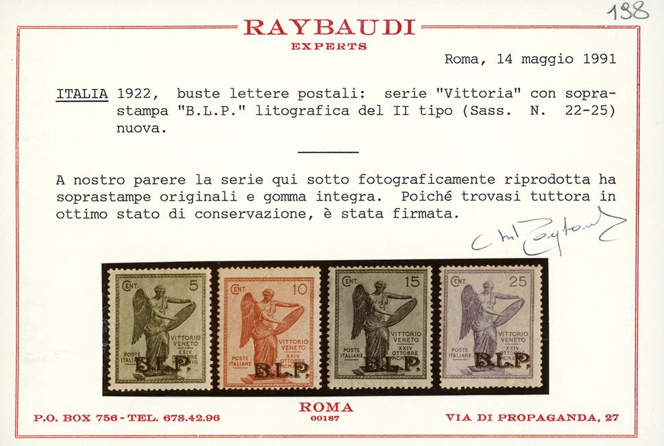 1922 - 5 cent. Vittoria, non emesso, soprastampato BLP, dent. 14 x 13 1/4, virgola dopo la P (22a/22d), gomma originale integra, perfetto e ben centrato. Rarissimo, probabilmente unico. Cert. Oro Raybaudi.