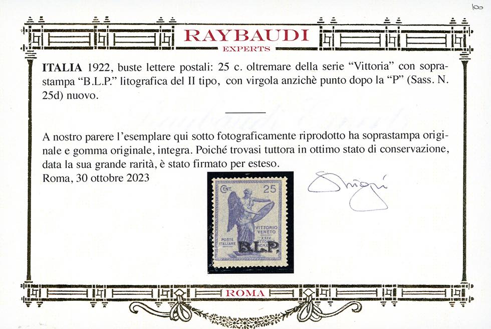 1922 - 25 cent. Vittoria, non emesso, soprastampa BLP, virgola dopo la P (25d), gomma originale integra, perfetto. Molto bello e probabilmente unico. Cert. Oro Raybaudi.