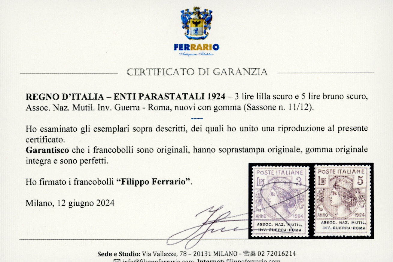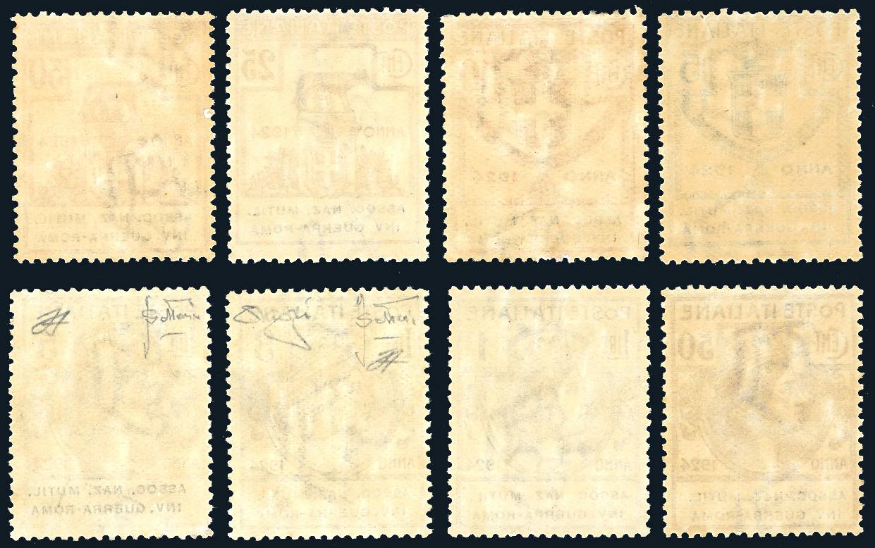 ASSOC.NAZ.MUTIL.INV.GUERRA-ROMA 1924 - Serie completa (5/12), nuovi, gomma originale integra, perfetti. Il 3 lire ottimamente centrato. Alti valori cert. Ferrario.