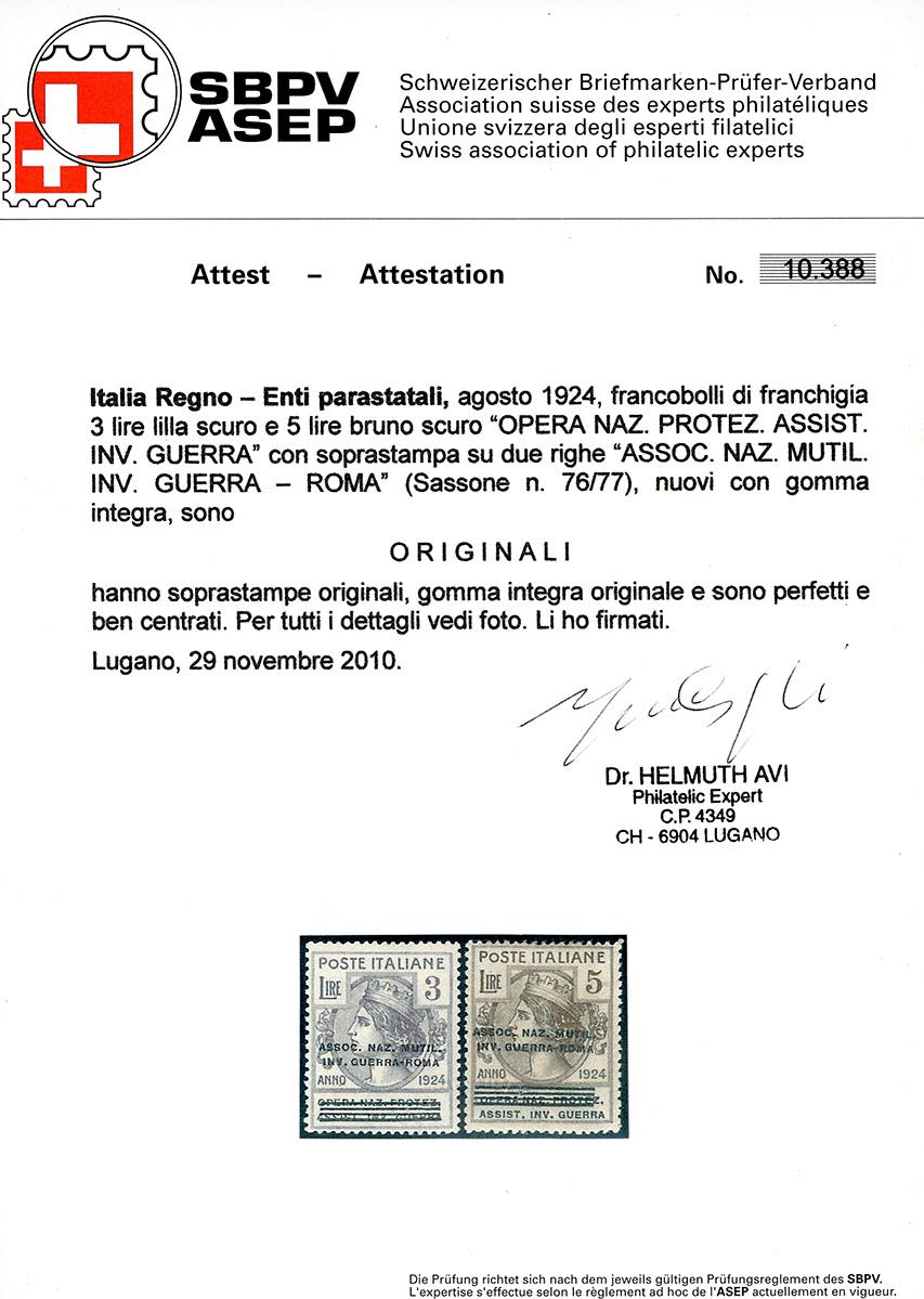 ASSOC.NAZ.MUTUL.INV.GUERRA-ROMA 1924 - Soprastampati, serie completa (70/77), ben centrati, gomma originale integra, perfetti e di ottima qualità. Cert. Avi per gli alti valori (cat.Sassone € 16.000/32.000).