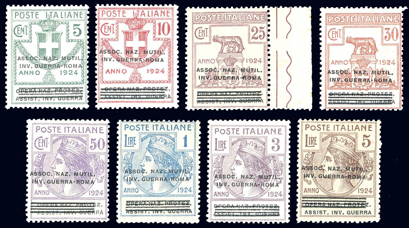 ASSOC.NAZ.MUTUL.INV.GUERRA-ROMA 1924 - Soprastampati, serie completa (70/77), ben centrati, gomma originale integra, perfetti e di ottima ... Leggi tutto