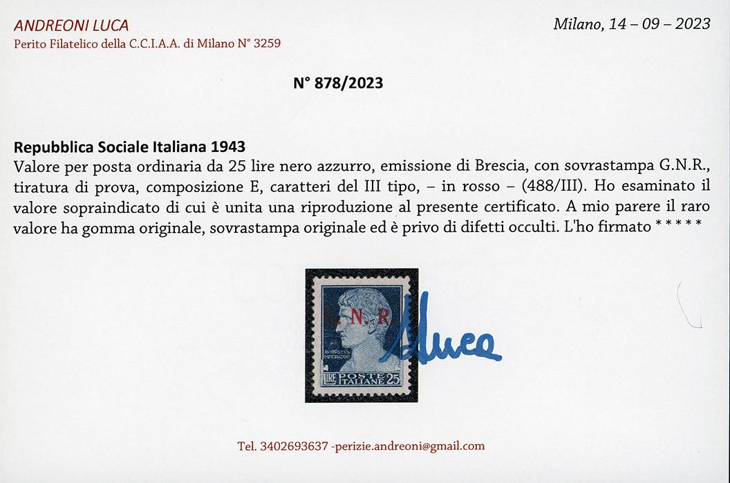 1943 - 25 lire nero azzurro, soprastampa G.N.R. del III tipo di Brescia (488/III), nuovo, gomma originale integra, perfetto. Splendido e molto raro. Pochi esemplari esistenti. Fiecchi, cert. G.Oliva, Andreoni (che lo riporta come gomma originale), Ferrario.