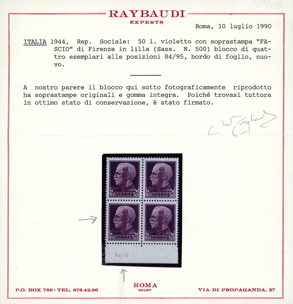 1944 - 50 lire soprastampa fascio in lilla, tiratura di Firenze (500), bordo di foglio, nuovo, gomma integra, perfetto. G.Oliva, cert. Raybaudi e Ferrario.