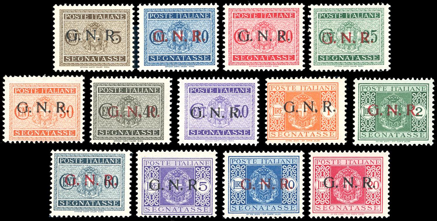 1944 - Soprastampati G.N.R. tiratura di Verona, serie completa (47/59), nuovi, gomma originale integra, perfetti. Ottima qualità. Alti valori cert. Caffaz.