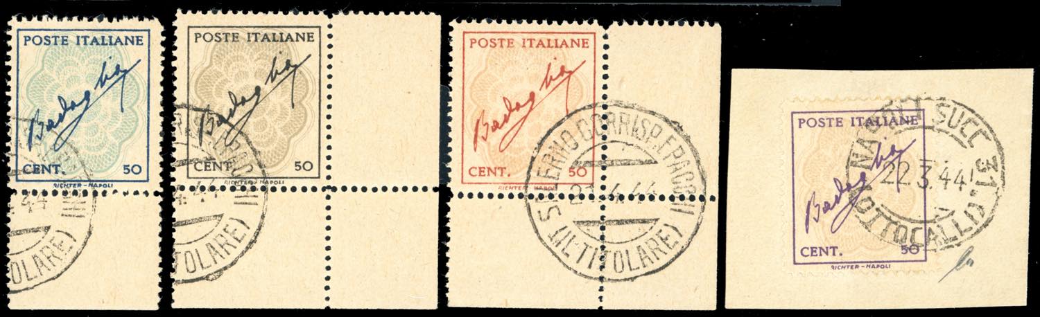 1944 - Badoglio, serie completa, senza filigrana (515F/515I), tre esemplari, angolo di foglio, usati, perfetti. Molto belli e rari. Cert. Ferrario.