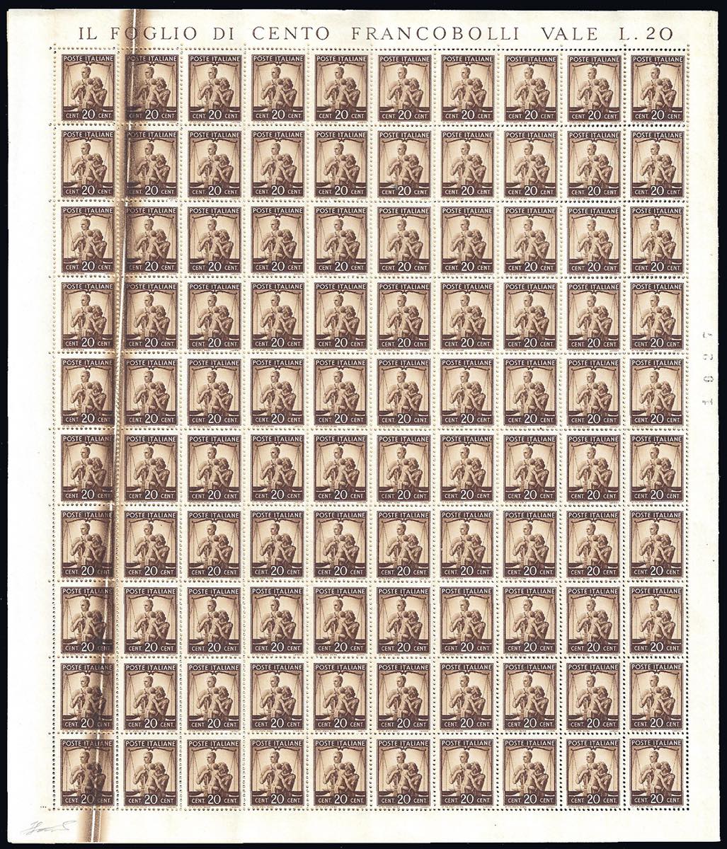 1945 - 20 cent. Democratica (544), foglio completo di 200 esemplari con interspazio di gruppo al centro, i valori delle prime due colonne interessati da un evidente taglio chirurgico obliquo, gomma originale integra, perfetto. Molto bello. Ferrario.