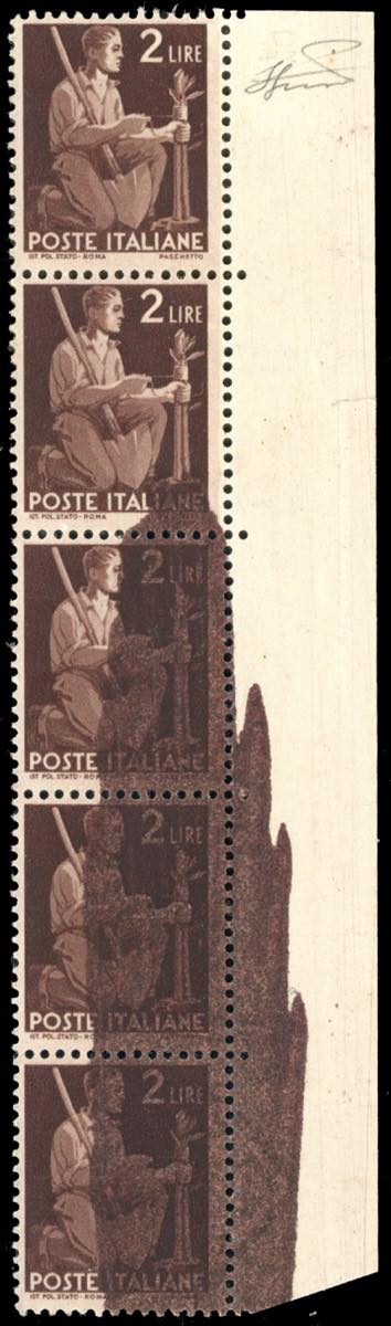 1945 - 2 lire Democratica (552), striscia verticale di cinque, quattro esemplari con diffuse macchie dovute ad anomala inchiostrazione, ... Leggi tutto