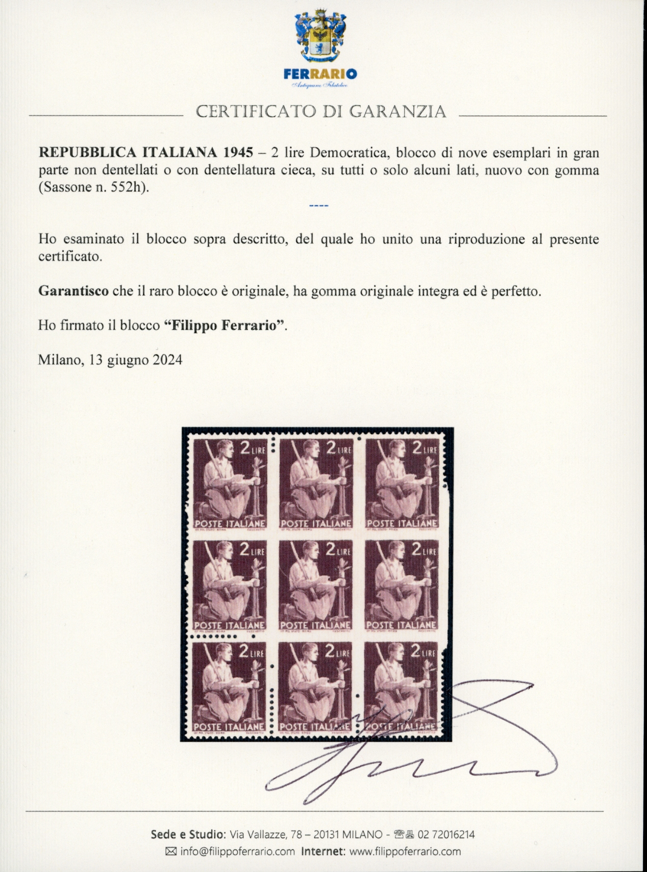 1945 - 2 lire Democratica, blocco di nove esemplari in gran parte non dentellati o con dentellatura cieca, su tutti o solo alcuni lati (552h), gomma originale integra, perfetto e di ottima qualità. Insieme rarissimo. Carraro, cert. Ferrario.