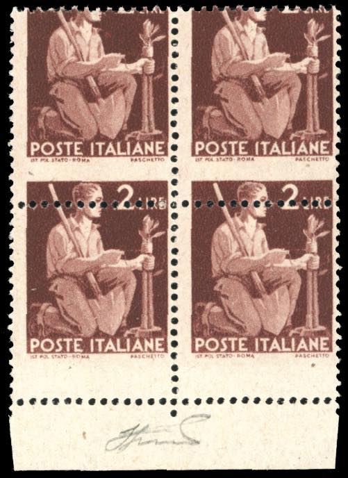 1945 - 2 lire Democratica, dentellatura orizzontale fortemente spostata in basso (552u), blocco di quattro, i due esemplari inferiori senza ... Leggi tutto
