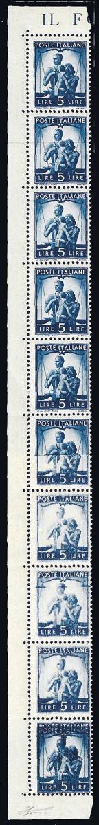 1945 - 5 lire Democratica, striscia verticale di 10 esemplari, l'ultimo con evidente doppia stampa e quattro con stampa evanescente ... Leggi tutto