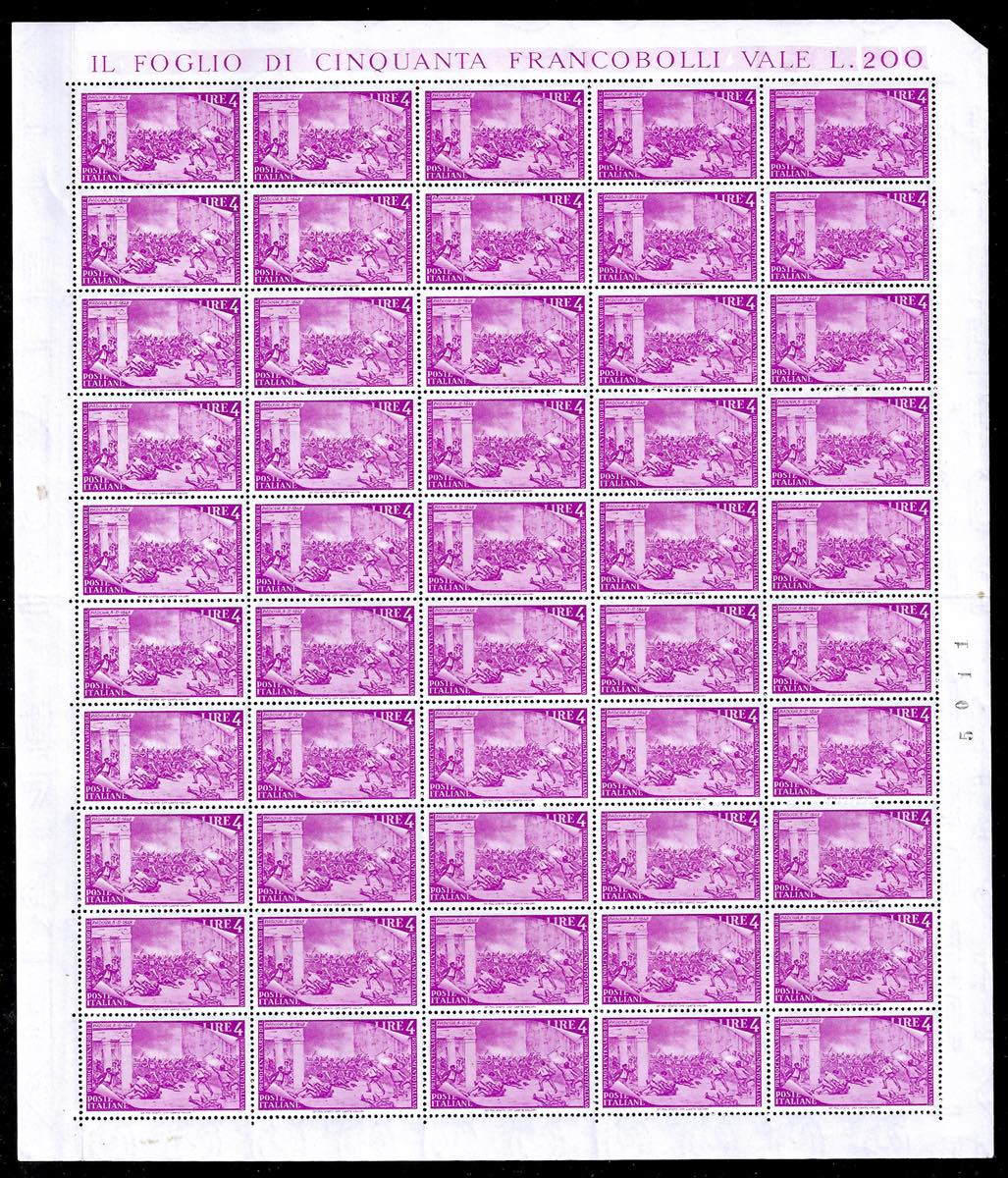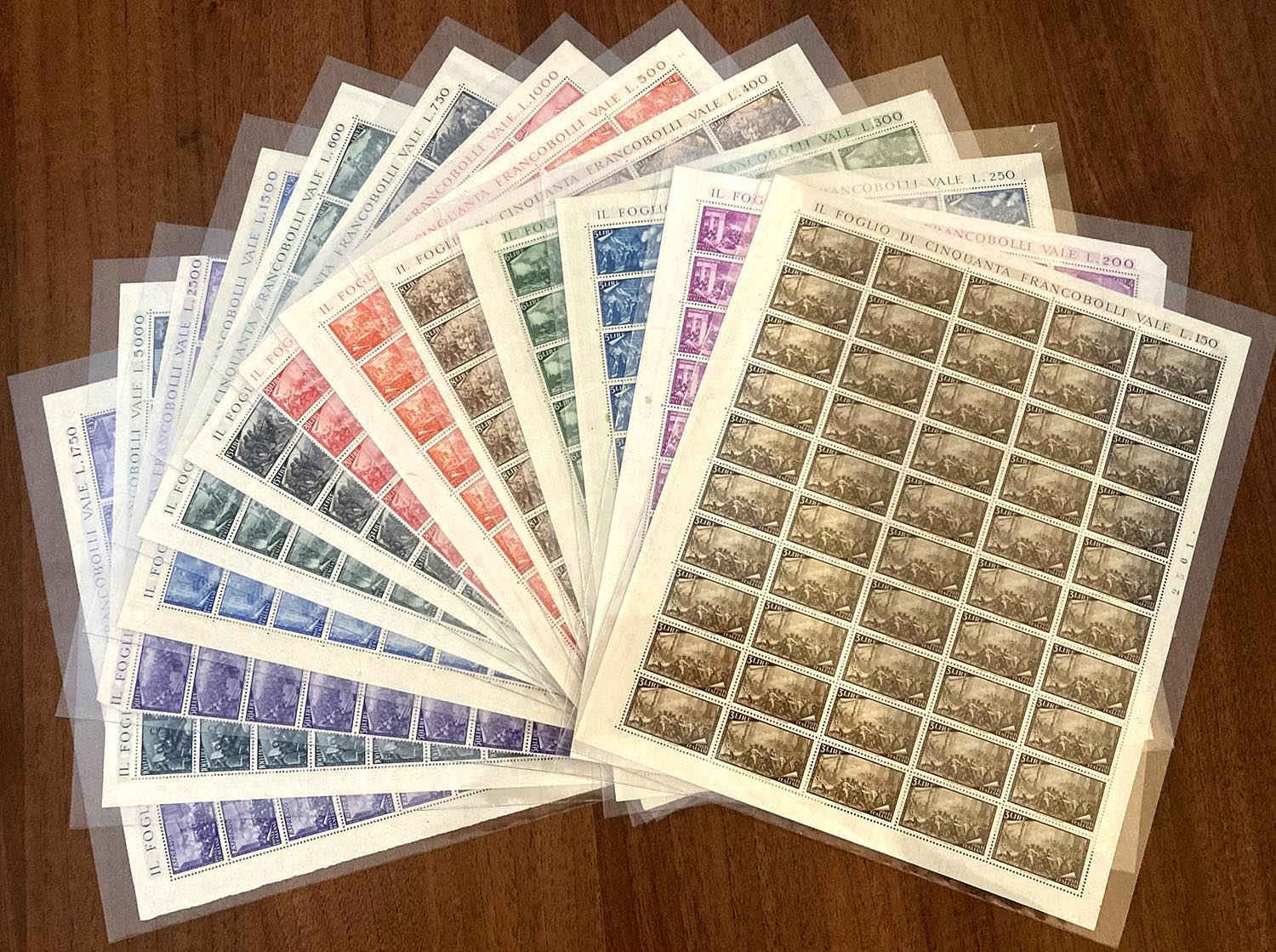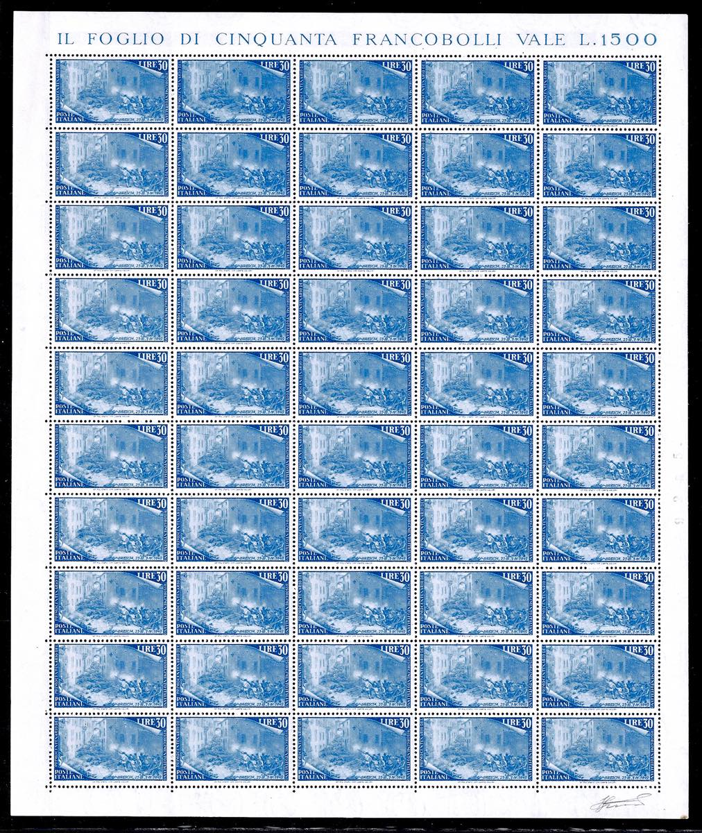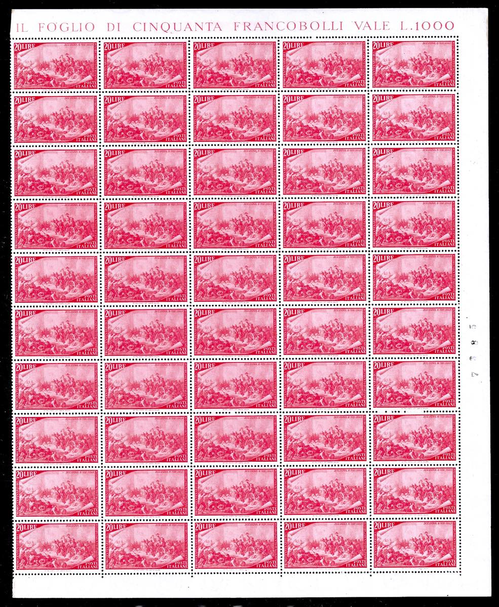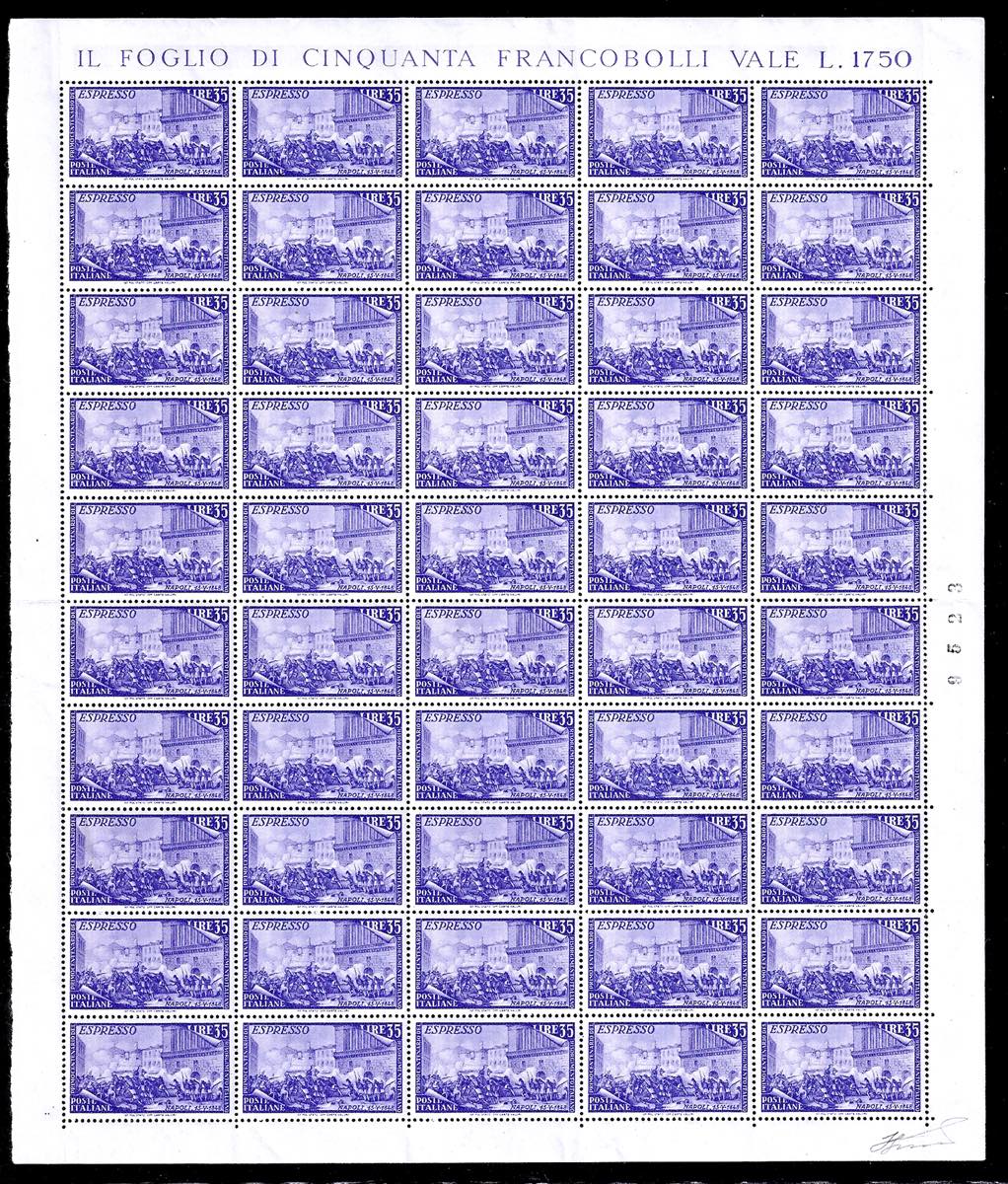 1948 - Risorgimento, serie completa (580/591+E), fogli nuovi di 50 esemplari, gomma originale integra, perfetti. Il 50 lire senza i margini laterali e leggermente aperta la dentellatura al centro. Molto freschi e generalmente ben centrati. Insieme raro. Cert. Ferrario per gli alti valori.