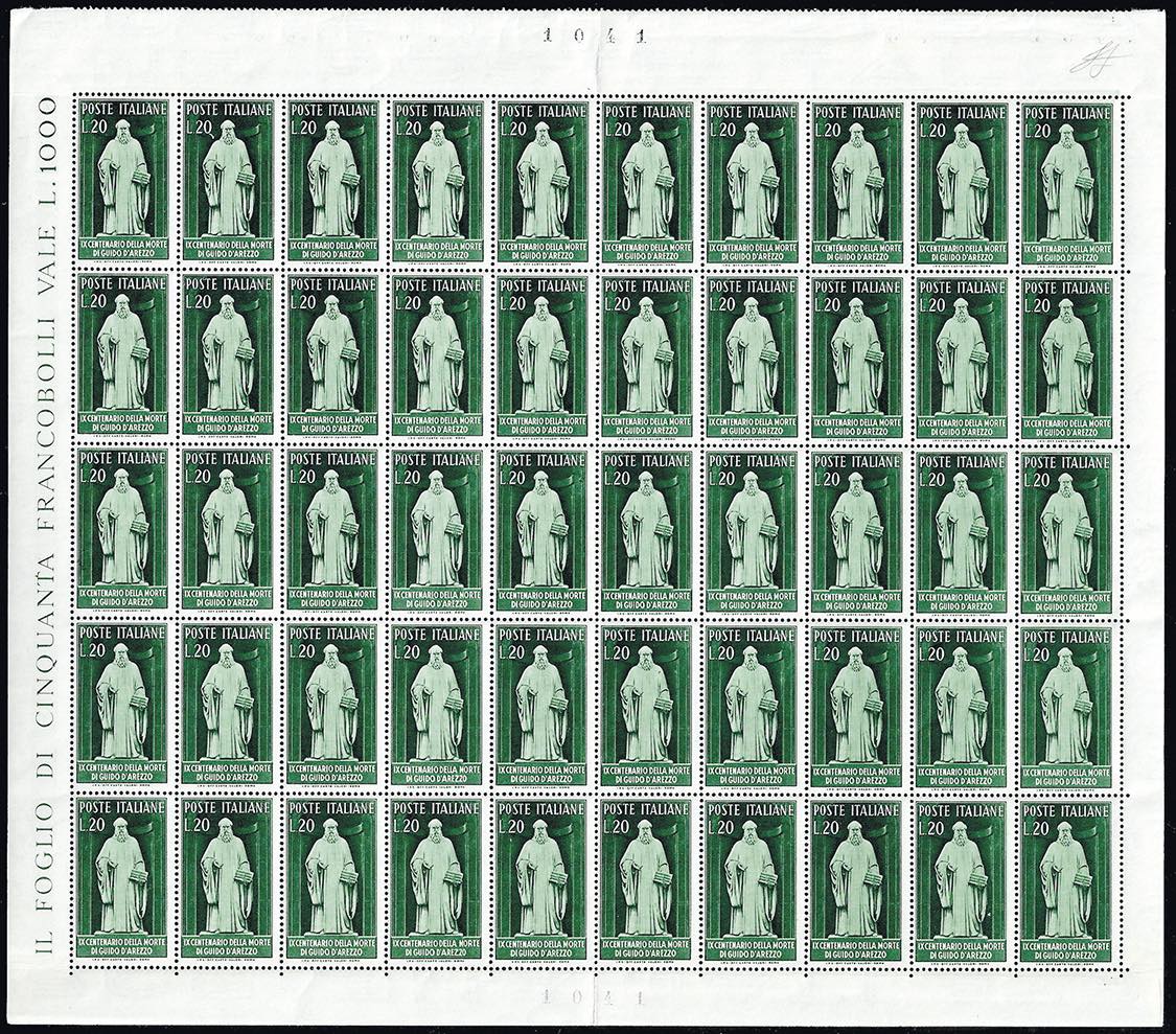 1950 - 20 lire Guido D'Arezzo (626), foglio nuovo di 50 esemplari, gomma originale integra, perfetto. Molto bello. Ferrario.