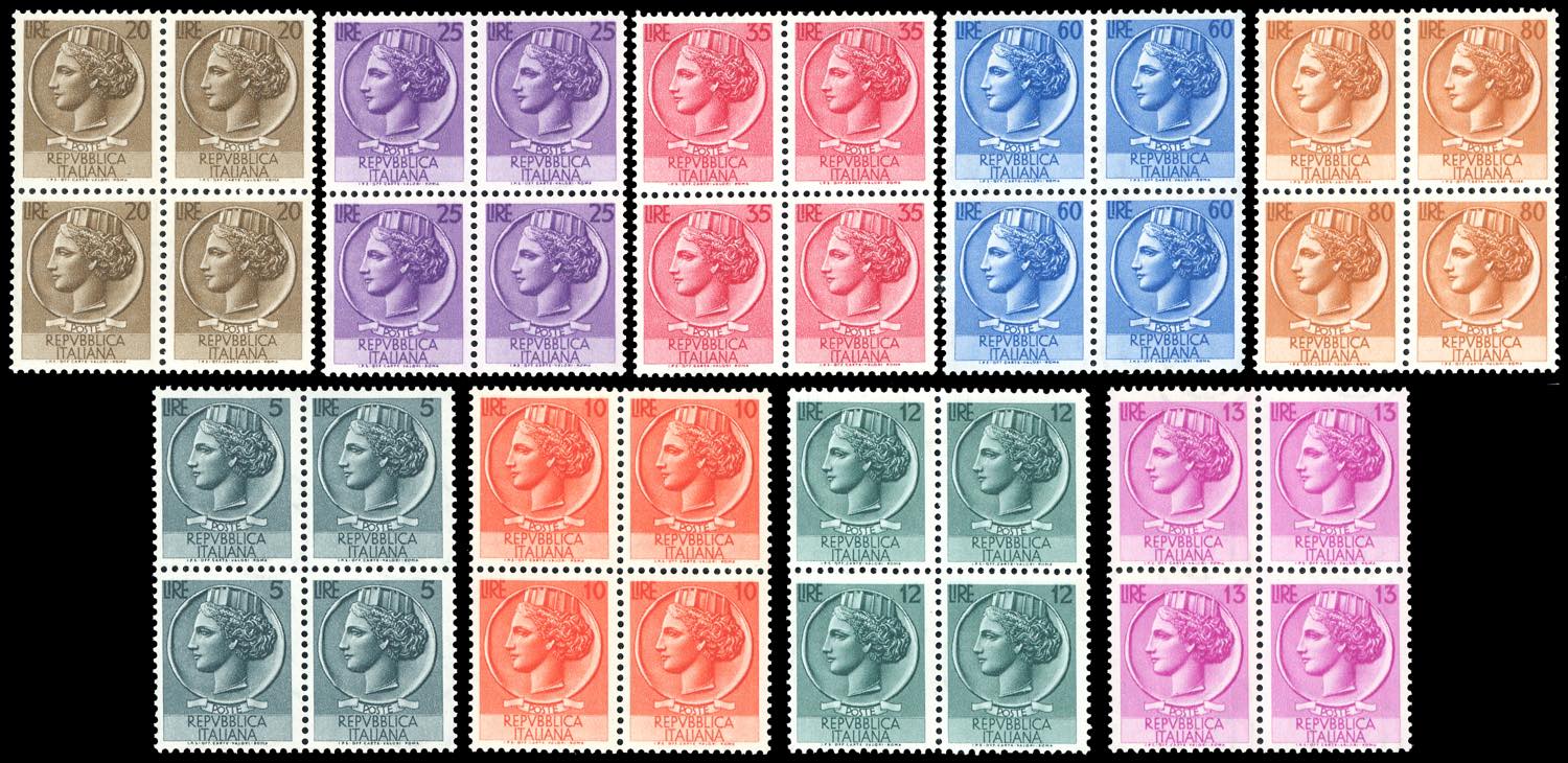 1953/54 - Siracusana, filigrana ruota, serie completa (710/718), blocchi di quattro, nuovi, gomma originale integra, perfetti e ben centrati. Molto belli. Alti valori Ferrario.