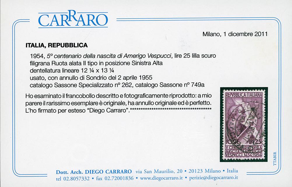 1954 - 25 lire Vespucci, dent. 12 1/4 x 13 1/4 (749/II), perfetto, usato a Sondrio 2/4/1955. Estremamente raro, pochissimi esemplari conosciuti. Cert. Carraro.