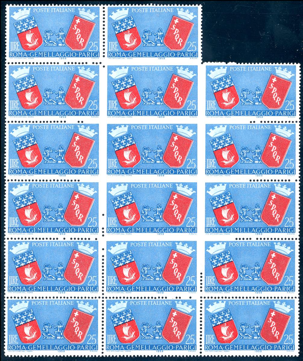 1959 - 25 lire Roma-Parigi, blocco di 17 esemplari, undici esemplari con varietà di dentellatura parziale o cieca, che hanno dato origine a due coppie orizzontali non dentellate al centro (857a), gomma originale integra, perfetto. Molto raro e di ottima qualità. Caffaz e Ferrario.