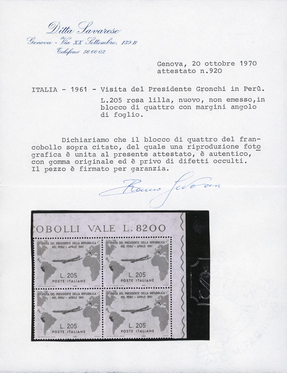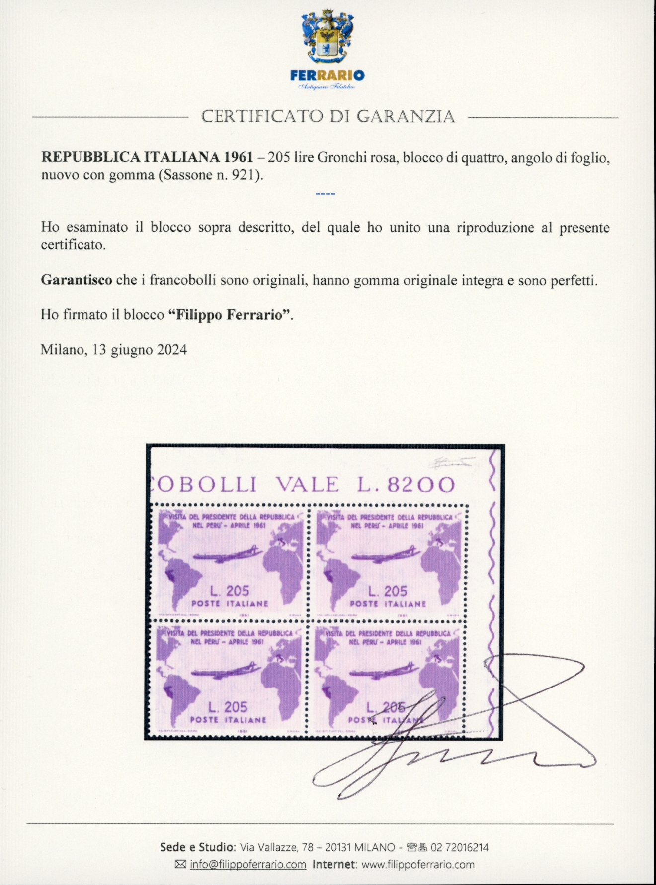 1961 - 205 Gronchi rosa (921), blocco di quattro, angolo di foglio, gomma originale integra, perfetto. Cert. Savarese (1970) e Ferrario. Leggi tutto