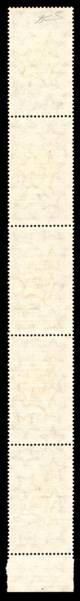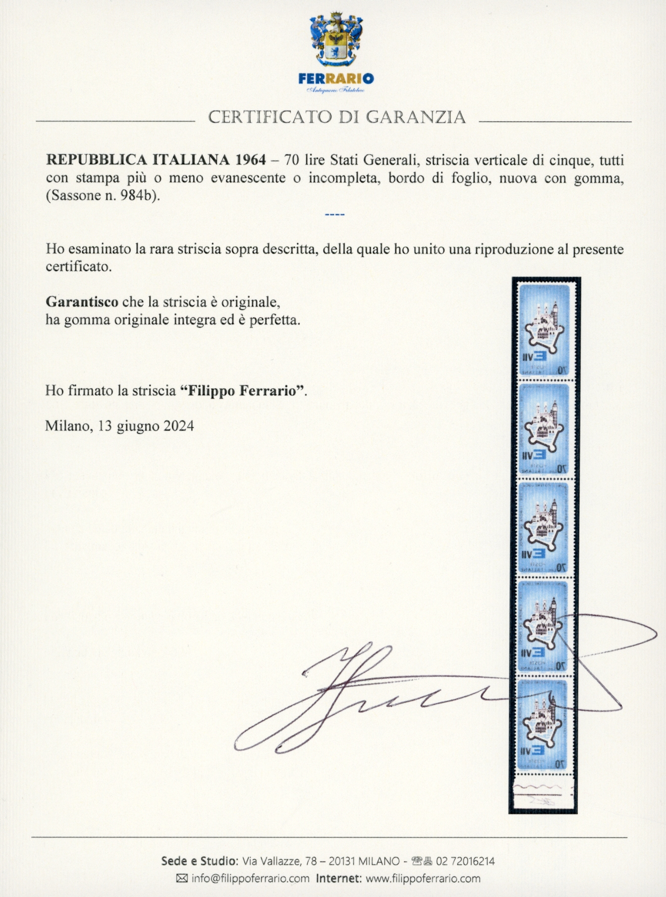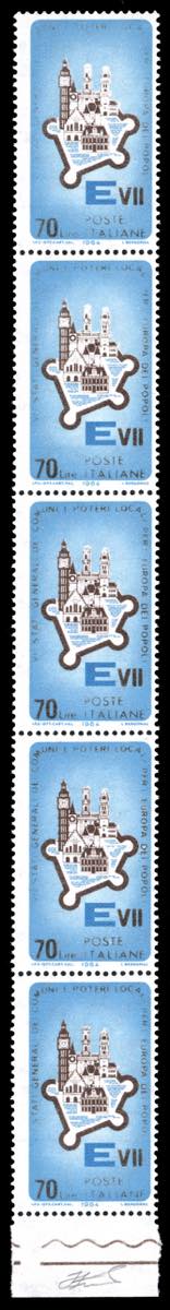 1964 - 70 lire Stati Generali, striscia verticale di cinque, tutti con stampa più o meno evanescente o incompleta (984b), bordo di foglio, gomma originale integra, perfetta. Rara. Cert. Ferrario.