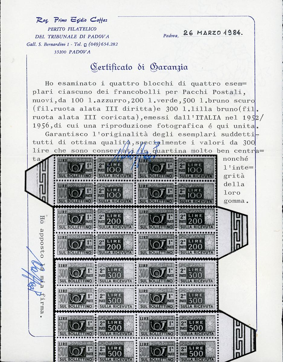 1948 - 300 lire filigrana ruota (79), blocco di quattro, nuovo, gomma originale integra, perfetto. Molto fresco e ben centrato. Cert. Caffaz e Ferrario.