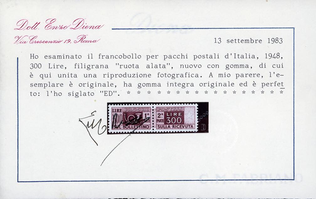 1948 - 300 lire filigrana ruota (79), ottima centratura, gomma originale integra, perfetto. Molto bello. Cert. E.Diena.
