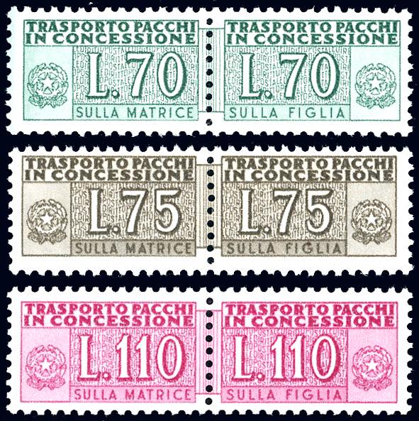 1955/66 - 70 lire, 75 lire e 110 lire lilla rosa, filigrana stelle (8,9,12), gomma originale integra, perfetti. Cert. Ferrario.