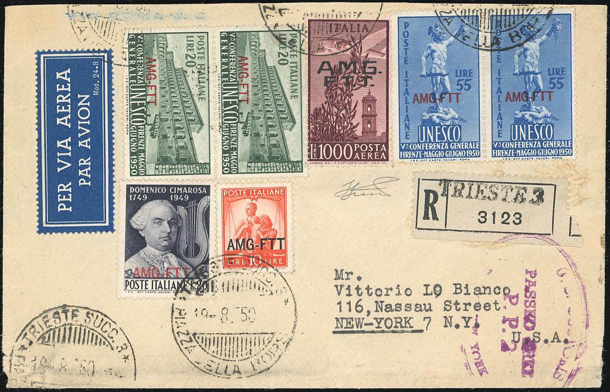 POSTA AEREA 1950 - 1.000 lire Campidoglio, soprastampa su due righe, 10 lire Democratica, 20 lire Cimarosa, 20 e 55 lire UNESCO, coppie (16,62,68,71/72), perfetti, su aerogramma raccomandato da Trieste 19/8/1950 a New York. Raro. Ferrario.