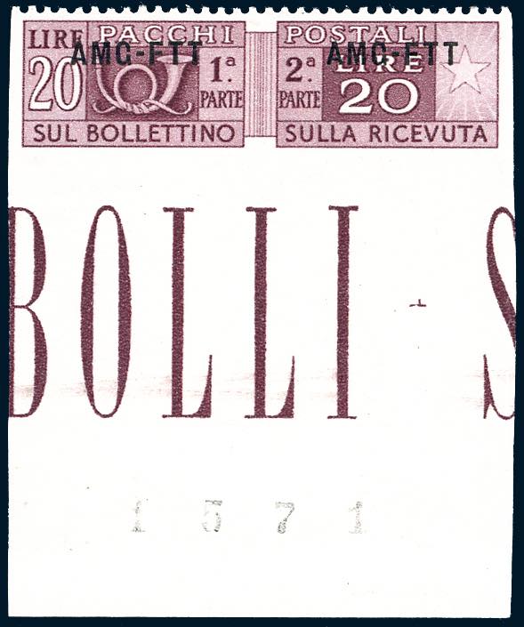 PACCHI POSTALI 1949 - 20 lire, soprastampa su una riga, dentellato solo in alto (19n), bordo di foglio, gomma originale integra, perfetto. ... Leggi tutto