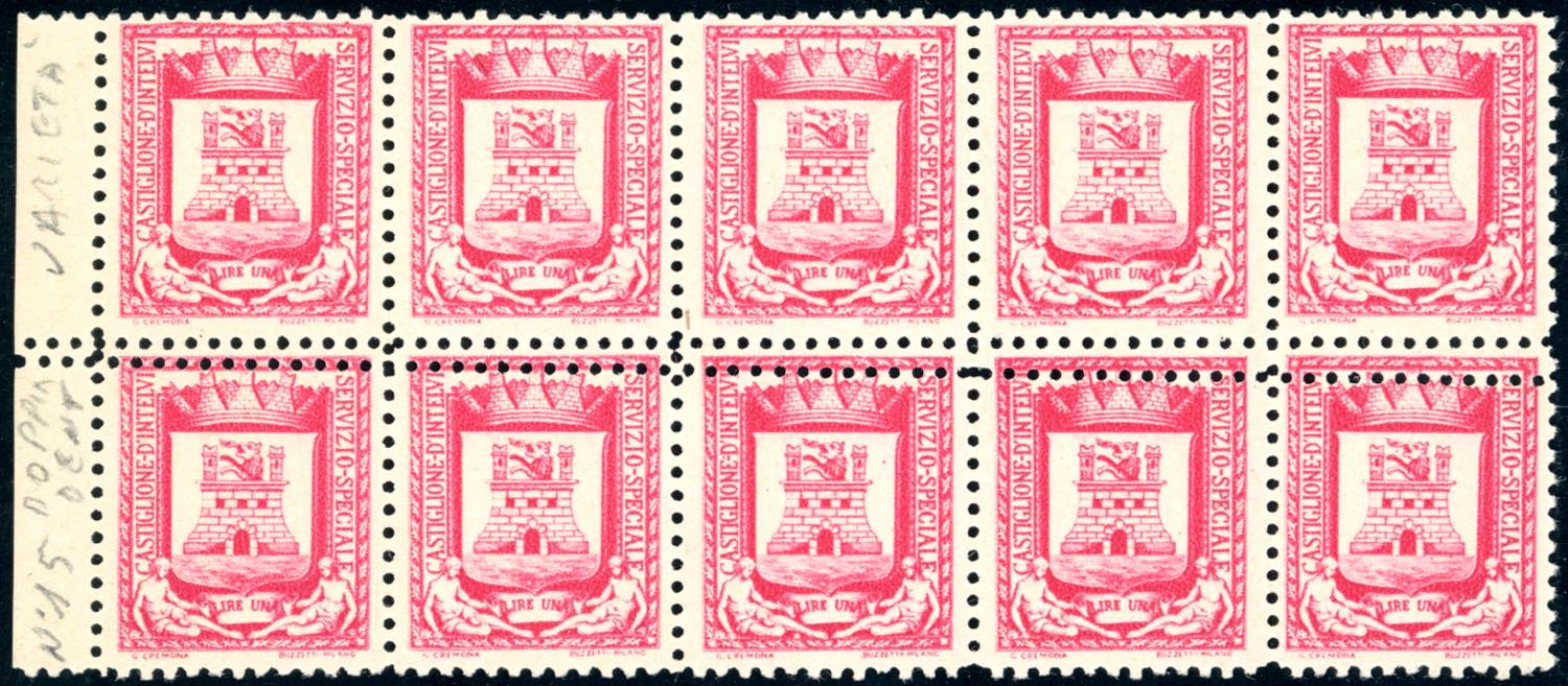 CASTIGLIONE D'INTELVI 1945 - 1 lire Stemma, blocco orizzontale di 10 esemplari con doppia dentellatura al centro (15d), bordo di foglio, ... Leggi tutto