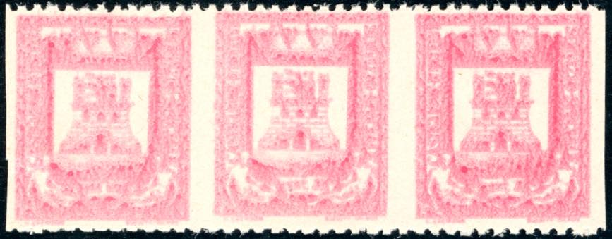 CASTIGLIONE D'INTELVI 1945 - 50 cent. rosa vivo Stemma, colori invertiti, stampa evanescente e non dentellato verticalmente (16b+16d), striscia orizzontale di tre, gomma originale integra, perfetta. Ferrario.