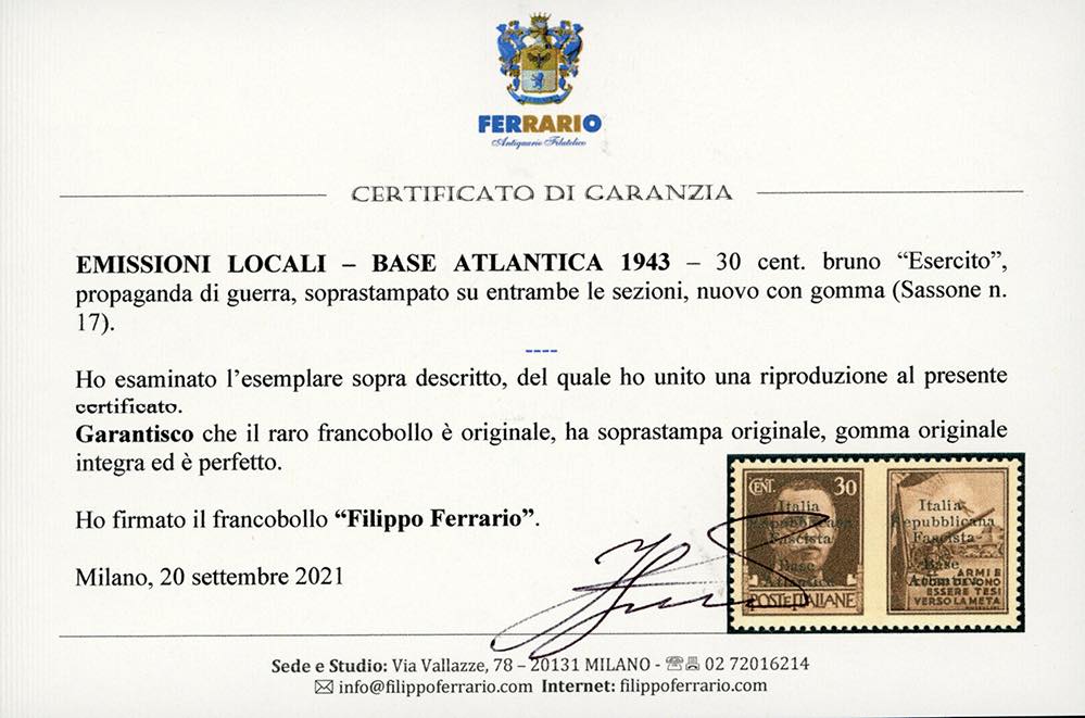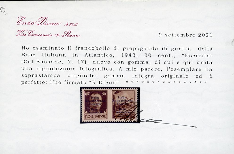 BASE ATLANTICA 1943 - 30 cent. Propaganda di guerra Esercito soprastampato (17), gomma originale integra, perfetto. Raro. Cert. Ferrario e ... Leggi tutto