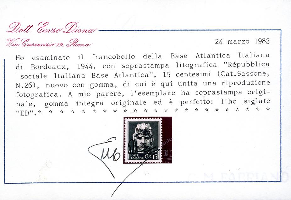 BASE ATLANTICA 1944 - Soprastampati, serie completa (24/29), gomma originale integra, perfetti. Molto rari, tiratura di soli 200 esemplari per il 5 cent., che non esiste ben centrato, infatti entrambi i fogli sono decentrati. Cert. Sorani per il n. 24 e 26, E.Diena per il n. 24, cert. Ferrario.