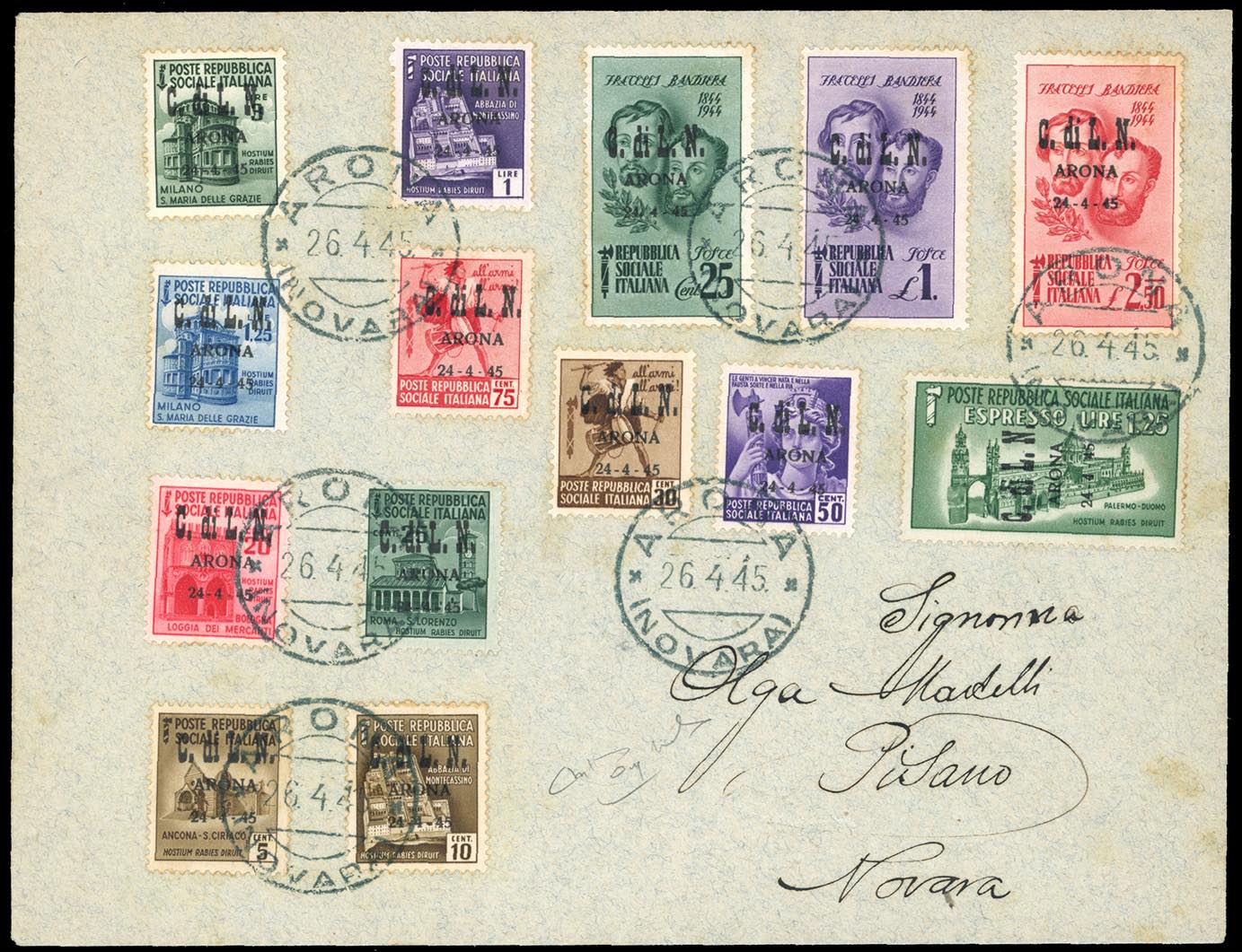 ARONA 1945 - Monumenti Distrutti e Fratelli Bandiera, serie complete (1/10,11/13,16), perfetti su busta da Arona 26/4/1945 a Pisano Novarese, bollo d'arrivo. Bella e non comune. Cert. Raybaudi.