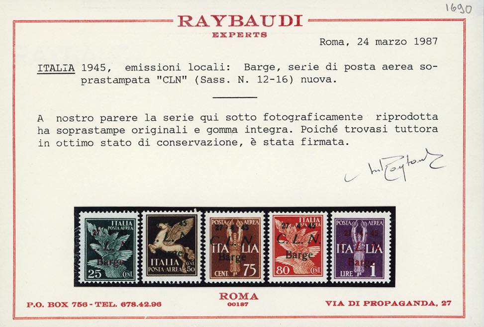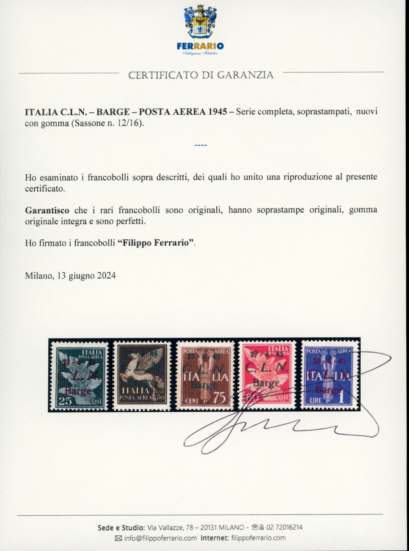 BARGE POSTA AEREA 1945 - Serie completa, soprastampati (12/16), nuovi, gomma originale integra, perfetti. Molto belli. Mondolfo, cert. Ferrario e Raybaudi.