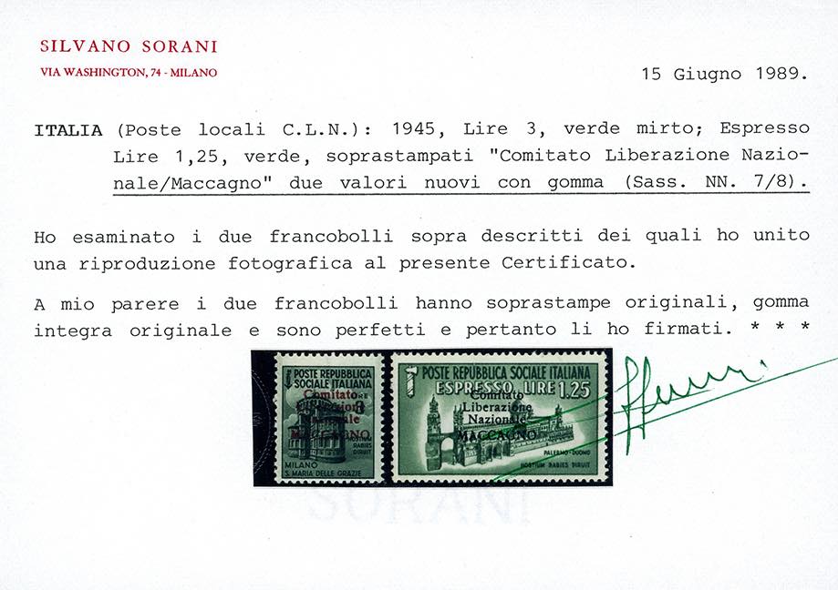 MACCAGNO 1945 - Monumenti Distrutti soprastampati, serie completa (1/8), nuovi, gomma originale integra, perfetti. Ottima qualità. Rari, tiratura solo 100 serie complete. Alti valori. Cert. Sorani.