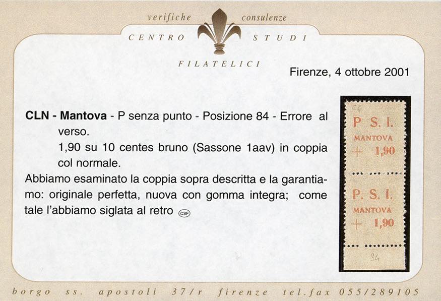MANTOVA 1945 -1,90 lire su 10 cent., soprastampa recto-verso, al verso senza punto dopo la "P", in coppia con il normale (1aav,1aa), gomma originale integra, perfetta. Probabilmente unico! Cert. Centro Studi Filatelici Firenze.