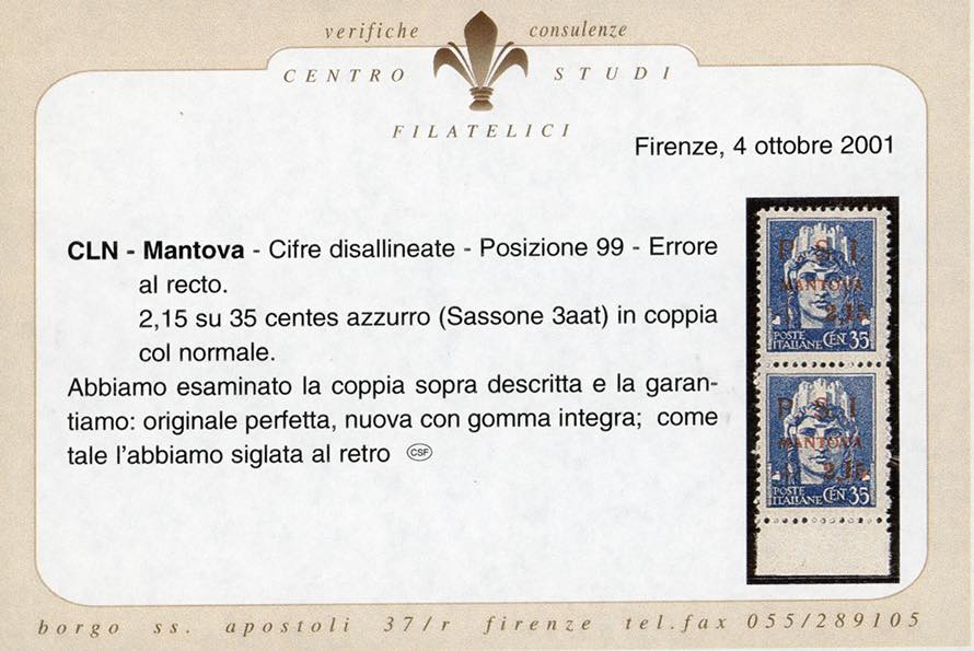 MANTOVA 1945 - 2,15 lire su 35 cent., soprastampa recto-verso, al recto punto piccolo dopo la "I" e cifra "1" spostata in alto, in coppia ... Leggi tutto