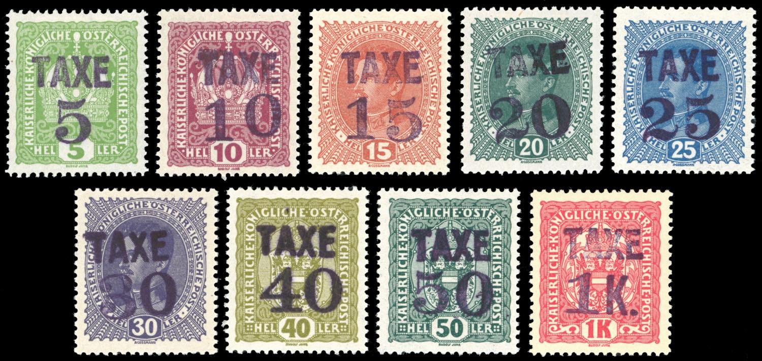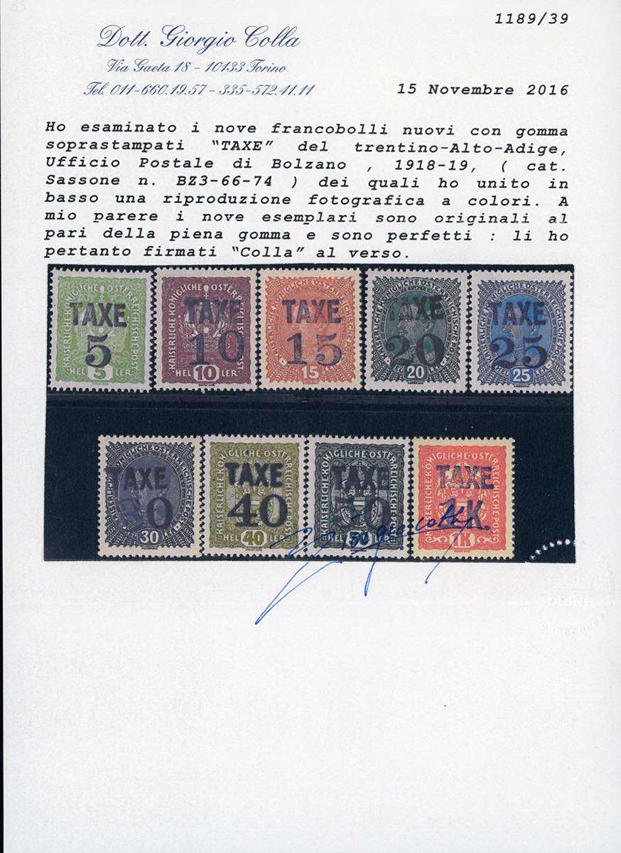 TRENTINO ALTO ADIGE-SEGNATASSE BOLZANO 1919 - Francobolli d'Austria soprastampati, serie completa (BZ3/66-74), nuovi, gomma originale, perfetti. Cert. Colla.