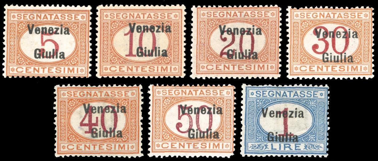 VENEZIA GIULIA SEGNATASSE 1918 - Soprastampati, serie completa (1/7), nuovi, gomma originale, perfetti. Molto freschi.