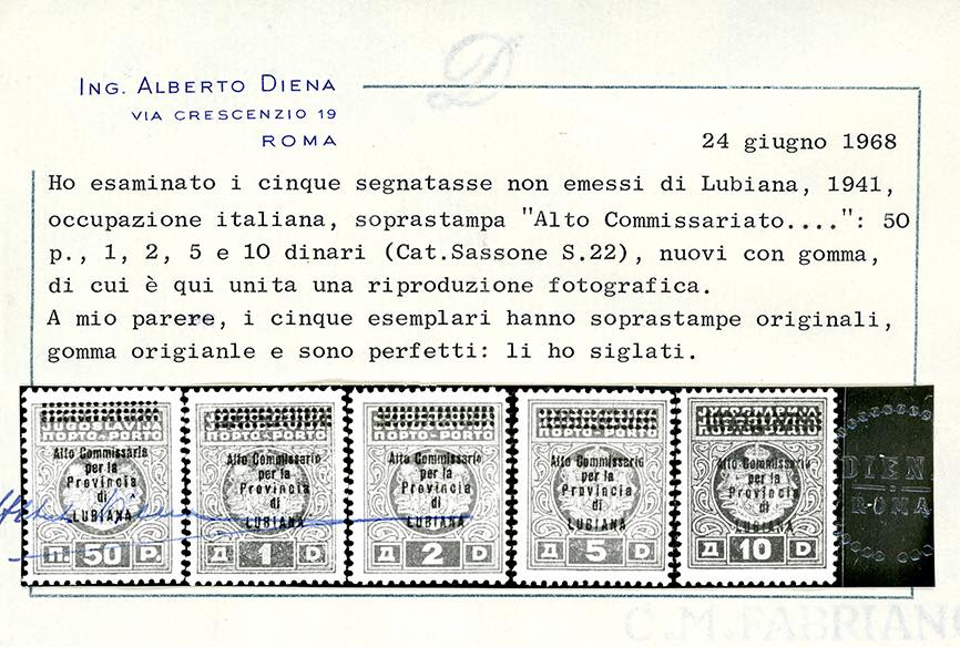 LUBIANA SEGNATASSE 1941 - Alto Commissario, soprastampati, non emessi, serie completa (16/20), gomma originale integra, perfetti e di ottima qualità. Splendidi ed estremamente rari. Sono note solo 42 serie complete, molte delle quali senza gomma o difettose. G.Bolaffi, Fiecchi, cert. Ferrario, Alberto e Raffaele Diena.