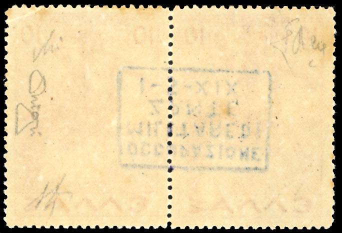 ZANTE POSTA AEREA 1941 - 10 d. + 10 d. Mitologica soprastampati in coppia, soprastampa capovolta (6Aa), gomma originale integra, ottimo stato, ininfluente minima piega in un angolo. UNICO ESEMPLARE NOTO CON SOPRASTAMPA CAPOVOLTA, si conosce un solo altro esemplare ma con la soprastampa diritta. Grandissima ed eccezionale rarità delle Occupazioni Italiane della II Guerra Mondiale. A.Diena, cert. Oro Raybaudi, E.Diena ed Avi.
