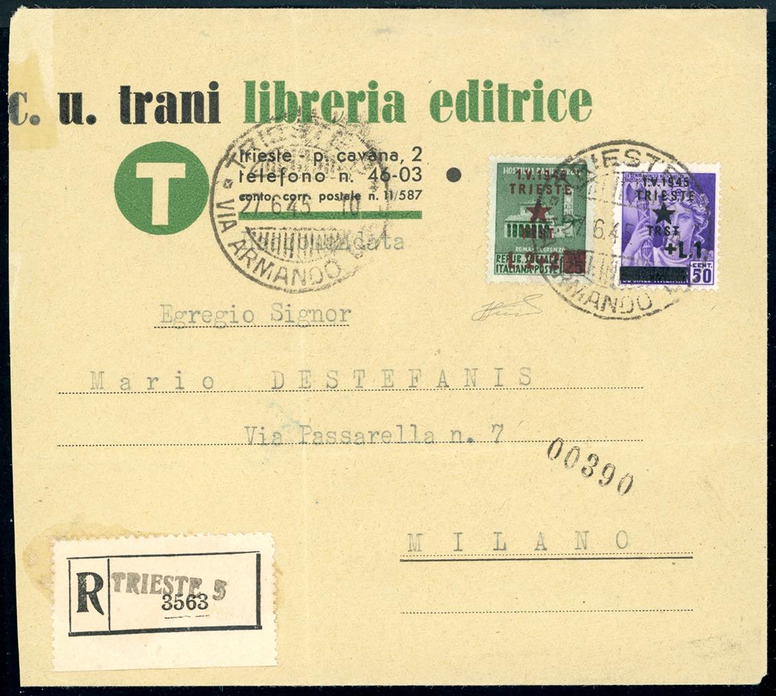 OCCUPAZIONE JUGOSLAVA TRIESTE 1945 - 1 lira su 50 cent. e 2 + 2 lire su 25 cent. (4,7), perfetti, su busta raccomandata da Trieste 27/6/1945 a Milano, bollo d'arrivo al verso. Rara. Ferrario.