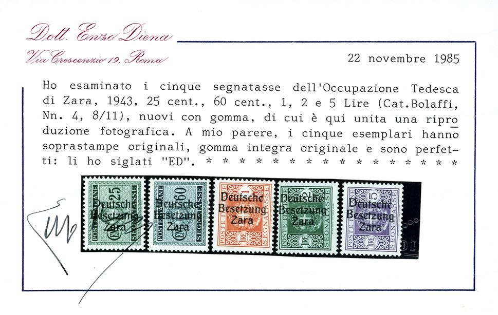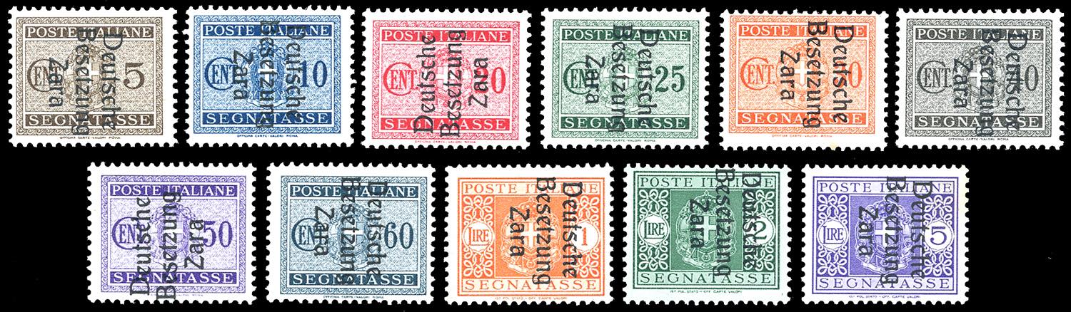 OCCUPAZIONE TEDESCA ZARA SEGNATASSE 1943 - Soprastampati, serie completa (1/11), nuovi, gomma originale integra, perfetti. Ottima qualità. Alti valori cert. Enzo Diena e Finanziario Bolaffi 100%.