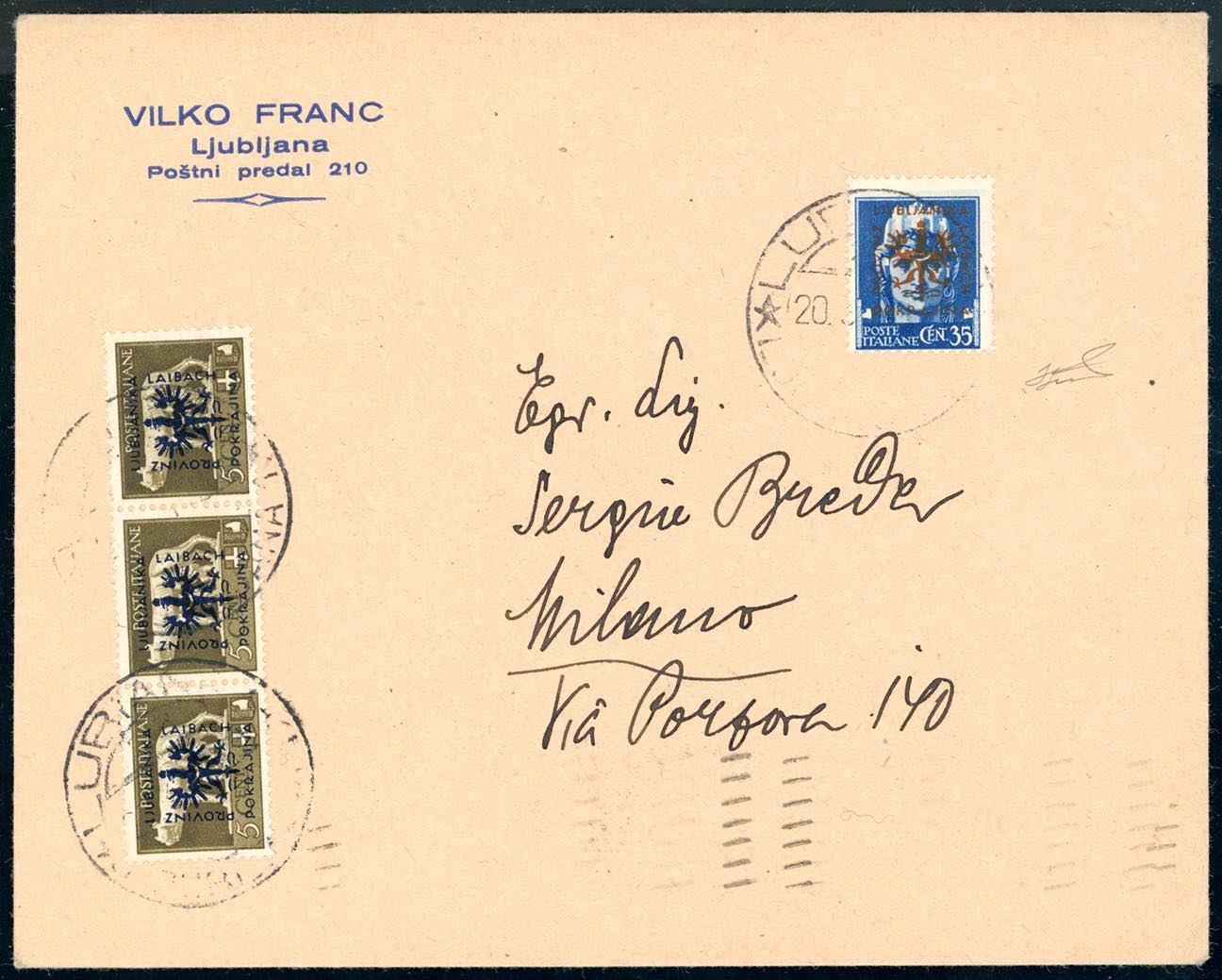 OCCUPAZIONE TEDESCA LUBIANA 1944 - 5 cent., striscia di tre, e 35 cent. soprastampati (1,7), perfetti, su busta da Lubiana 20/3/1944 a Milano, bollo di arrivo al verso. Non comune. Ferrario.