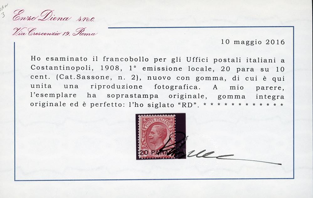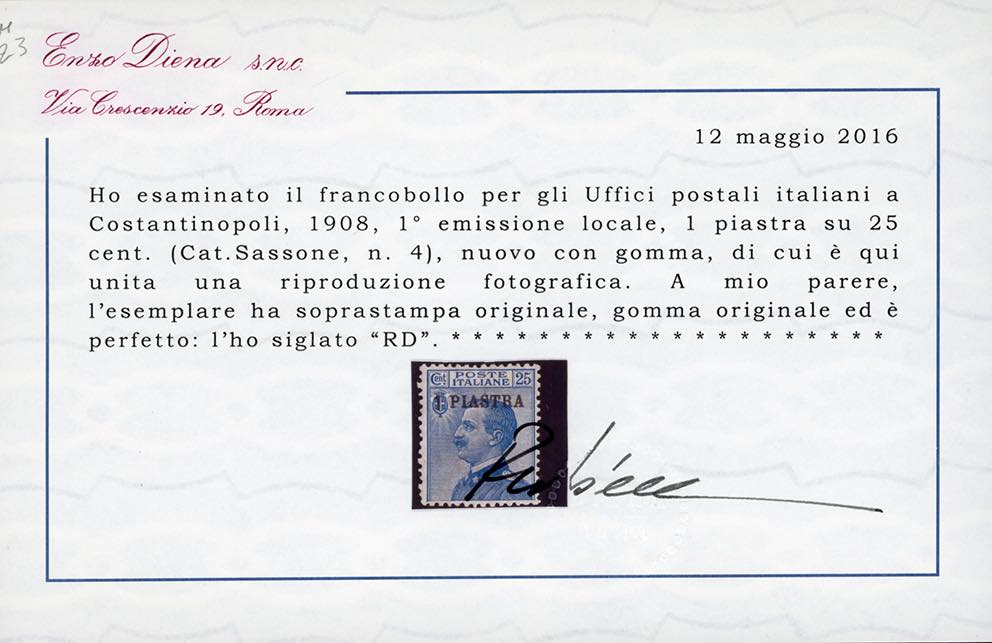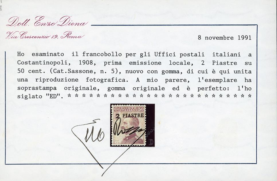 COSTANTINOPOLI 1908 - Prima emissione locale, i primi cinque valori soprastampati (1/5), nuovi, gomma originale, leggera traccia di linguella, perfetti. Il 20 parà cert. Diena, il 30 parà A.Diena e Mondolfo, 1 piastra cert. Diena, 2 piastre Oliva e cert. Diena.