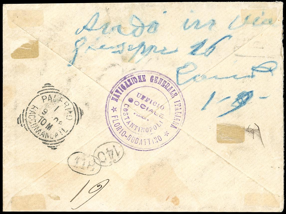 COSTANTINOPOLI 1908 - 20 pi., su 5 lire, III emissione locale (17), perfetto, isolato su busta raccomandata da Costantinopoli 27/8/1908 a Palermo, bollo d'arrivo, trasportata con la compagnia di navigazione Florio-Rubattino. Rara lettera risalente al primo mese d'uso. R.Diena, cert. Colla.
