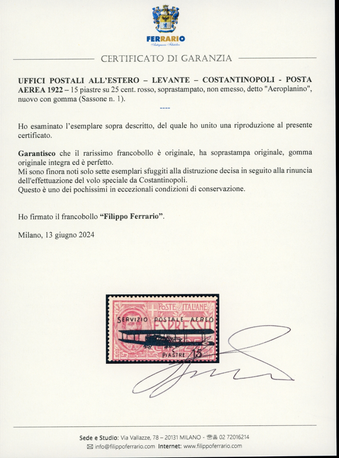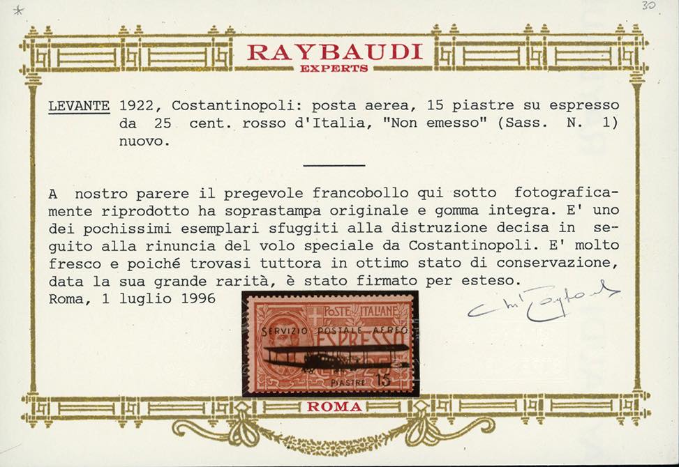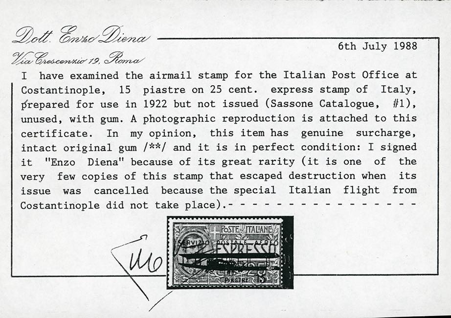 COSTANTINOPOLI POSTA AEREA 1922 - 15 piastre su 25 cent. soprastampato, non emesso, detto "Aeroplanino" (1), gomma originale integra, perfetto. Sono noti solo sette esemplari sfuggiti alla distruzione decisa in seguito alla rinuncia dell'effettuazione del volo speciale da Costantinopoli. Questo è in eccezionali condizioni di conservazione e può essere considerato UNO DEI MIGLIORI ESEMPLARI ESISTENTI. Grande rarità della Posta Aerea mondiale. Fotocopia cert. E.Diena, certificati: Oro Raybaudi, Avi e Ferrario.